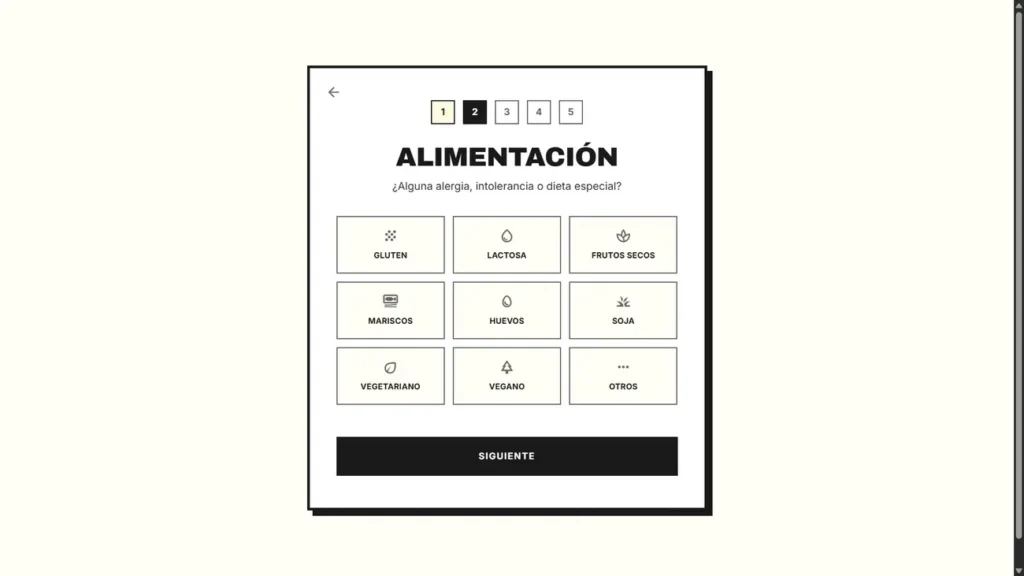 Un formulario bonito donde confirman, eligen menú, indican alergias y si necesitan transporte.